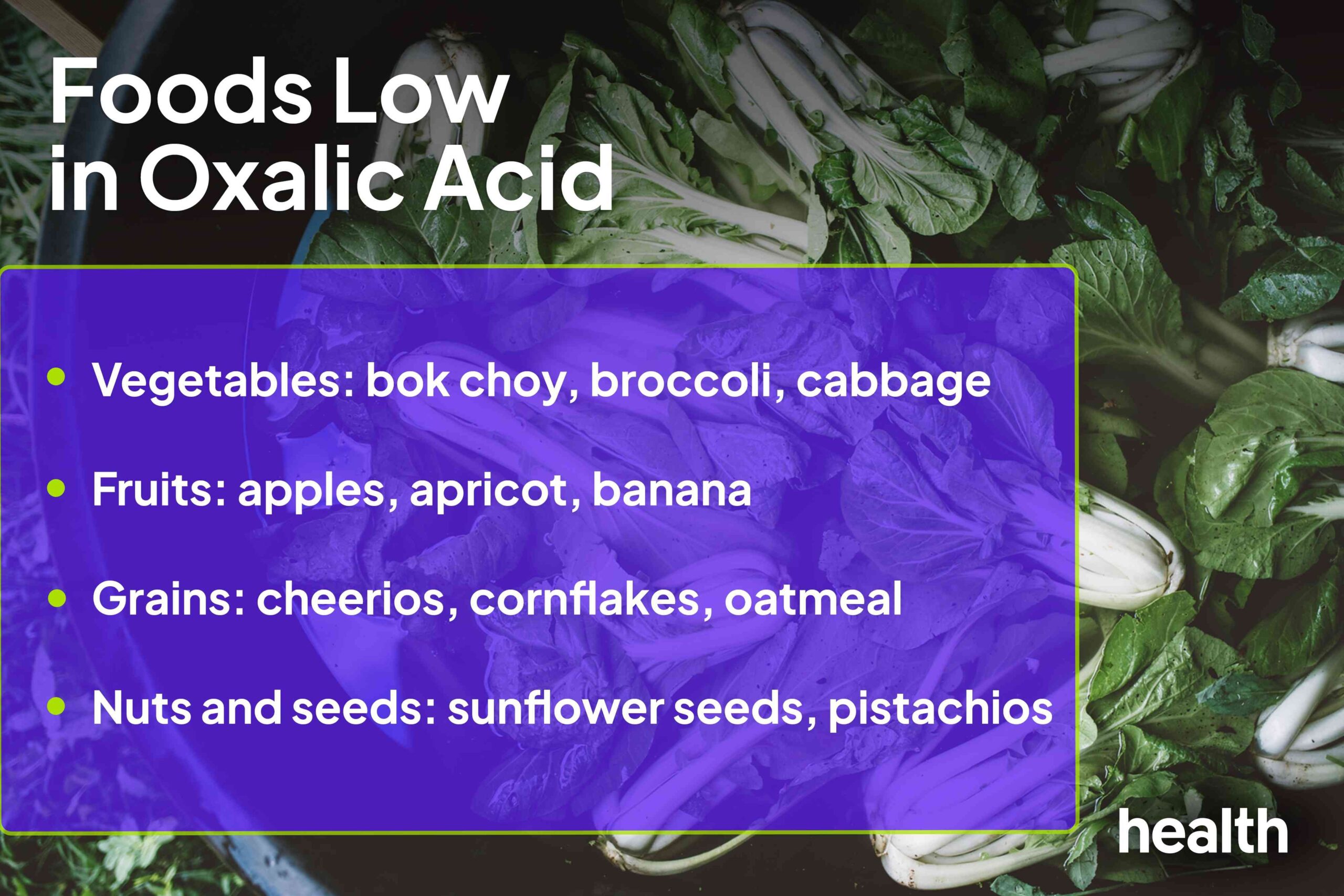 Muchos alimentos nutritivos tienen un alto contenido natural de oxalato. Aquí hay un desglose por categoría: